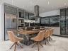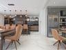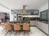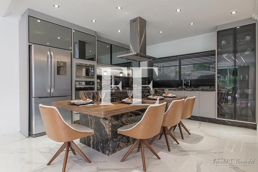 Living integrado e pé direito duplo no hall. Cozinha com ilha e espaço gourmet interno com churrasqueira à carvão.